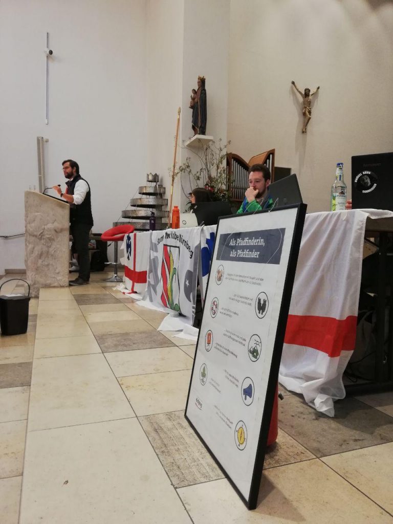 Nach diesem Erfolg waren alle bereit für die etwas schwierigere vierte Phase: die Anträge. Mit Hilfe von einem rennenden Mikro und einigen Mauschelpausen mit Abstand, schafften wir es auch in der großen Kirche gut zu diskutieren und abzustimmen. Phase 5 kann abschließend als Kür betrachtet werden: wir wagten einen kleinen Ausblick in das kommende Jahr und bedankten uns bei einigen Leiter*innen, welche ihre Leitungstätigkeit beendet haben, mit einem kleinen Foto-Quiz sowie Geschenken. Außerdem konnten wir unsere ehemaligen Stammesvorsitzende Sina Dölfel, welche wir bisher noch nicht gebührend aus ihrem Amt verabschieden konnten, endlich mit einem kleinen Spiel sowie umgedichteten Lied feiern.