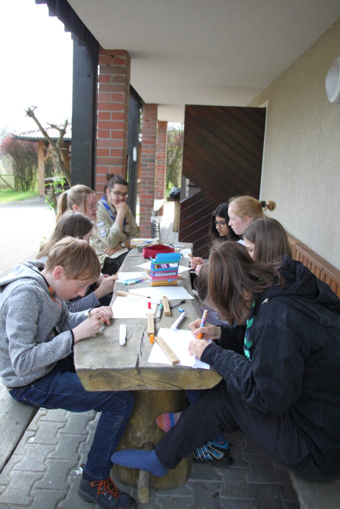 Am nächsten Morgen ging es nach dem Frühstück direkt auf die Spielwiese, hier sprechen die Bilder wohl für sich selbst. Es war ein großer Spaß! Danach ging es weiter mit einer Runde Werwolf und ein bisschen Kunst, da die Gruppe sich zu Beginn des Jahres vorgenommen hatte, Zahnbürsten zu gestalten. Denn was viele nicht wissen, das kleine Loch an der Kluftbrusttasche ist nicht etwa für einen Stift gedacht, nein eigentlich gehört dort eine selbst designte und handbemalte Zahnbürste hinein.