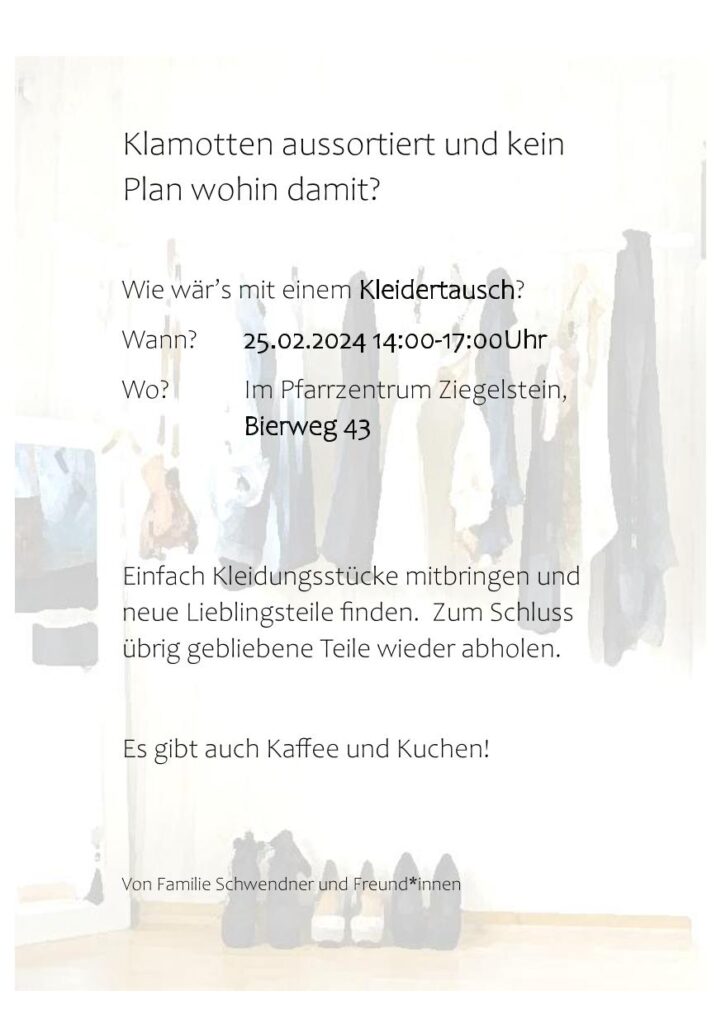 Nachdem das Konsumverhalten heutzutage immer extremer wird, möchte wir der Umwelt zuliebe mit unserem Kleidertausch dagegen steuern. Jeder und jede von uns hat genug Kleidung, die man nicht mehr wirklich trägt und die für andere vielleicht das neue Lieblingsstück werden können. Falls du noch nie dabei warst, hier eine kleine Erklärung: Bringe deine alten, gut erhaltenen und sauberen Kleidungsstücke, Schuhe und Accessoires (für Damen, Herren + Kinder) mit und lege/ hänge sie sortiert in die ausgeschilderten Bereiche. Und dann kannst du auch schon losstöbern! Schau dich um, probiere an und nimm das mit, was dir gefällt. Falls du Lust hast einen Kuchen oder Fingerfood beizusteuern, kannst du uns gerne schreiben. Kaffee, ein bisschen Kuchen und Kaltgetränken werden auch von uns gestellt werden. Finanzielle Spenden werden für die Organisation des Kleidertausches genutzt oder an Hilfsorganisationen weitergeben. Hol bitte, wenn möglich, deine übrigen Kleidungsstücke am Ende wieder ab. Sollte etwas liegen bleiben, spenden wir es an die Obdachlosenhilfe für Jugendliche oder an andere Hilfsorganisationen. Wir freuen uns sehr auf dein Kommen!