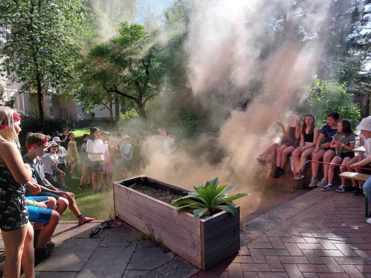 Mit knapp 90 Kindern und fast 20 Leitenden machten wir uns Mitte Oktober in 3 Reisebussen auf ins Pfadfinderzentrum Rothmannsthal. Nachdem alle in ihre Zimmer und Matratzenlager eingezogen waren, trafen wir uns im Speisesaal. Die Leitenden, mit Ohropax bewaffnet, hielten die Meute im Zaum, bis es kurz vorm Abendessen plötzlich viel Rauch und Musik gab….