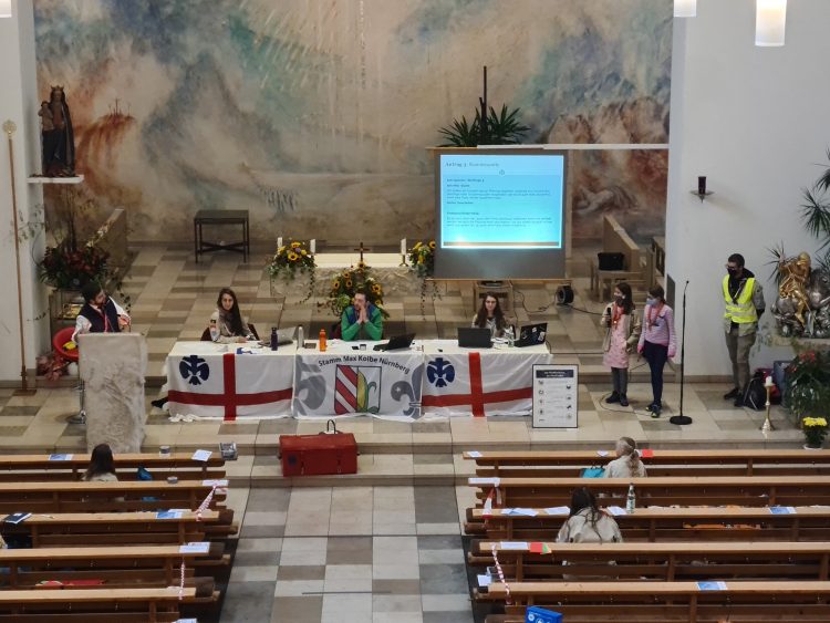 Die etwas andere Stammesversammlung von Max Kolbe zu Corona-Zeiten. Aufgrund der aktuellen Situation wählen wir für die diesjährige Stammesversammlung einen etwas ungewöhnlichen Ort: unsere Kirche. Bereits um 9:30 Uhr trafen alle Delegierten und Schaulustigen ein, nur um festzustellen, dass dort vorne ein Einsatzleiter stand, welcher alle lautstark darauf aufmerksam machte, ja nur pfadfinderisch zu handeln…