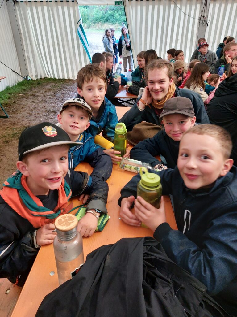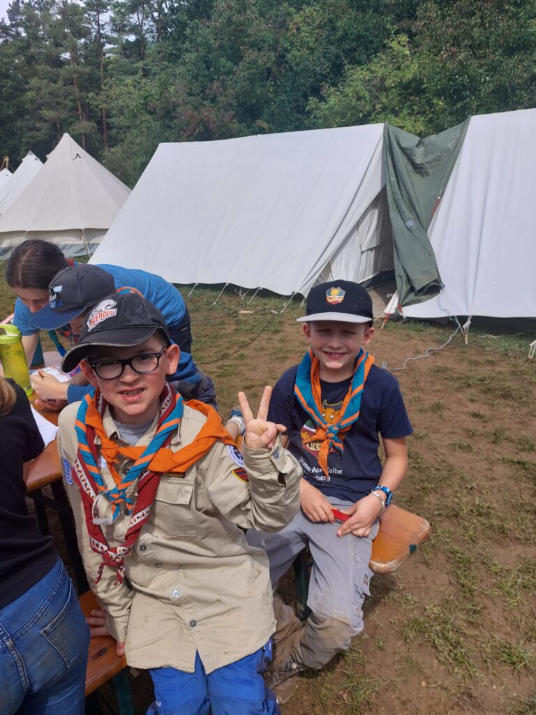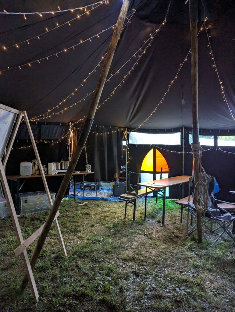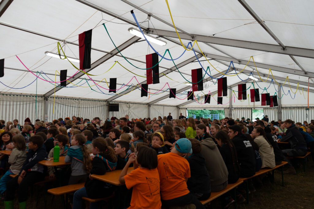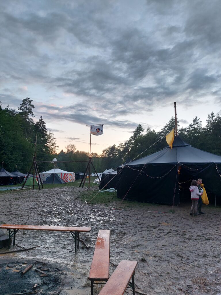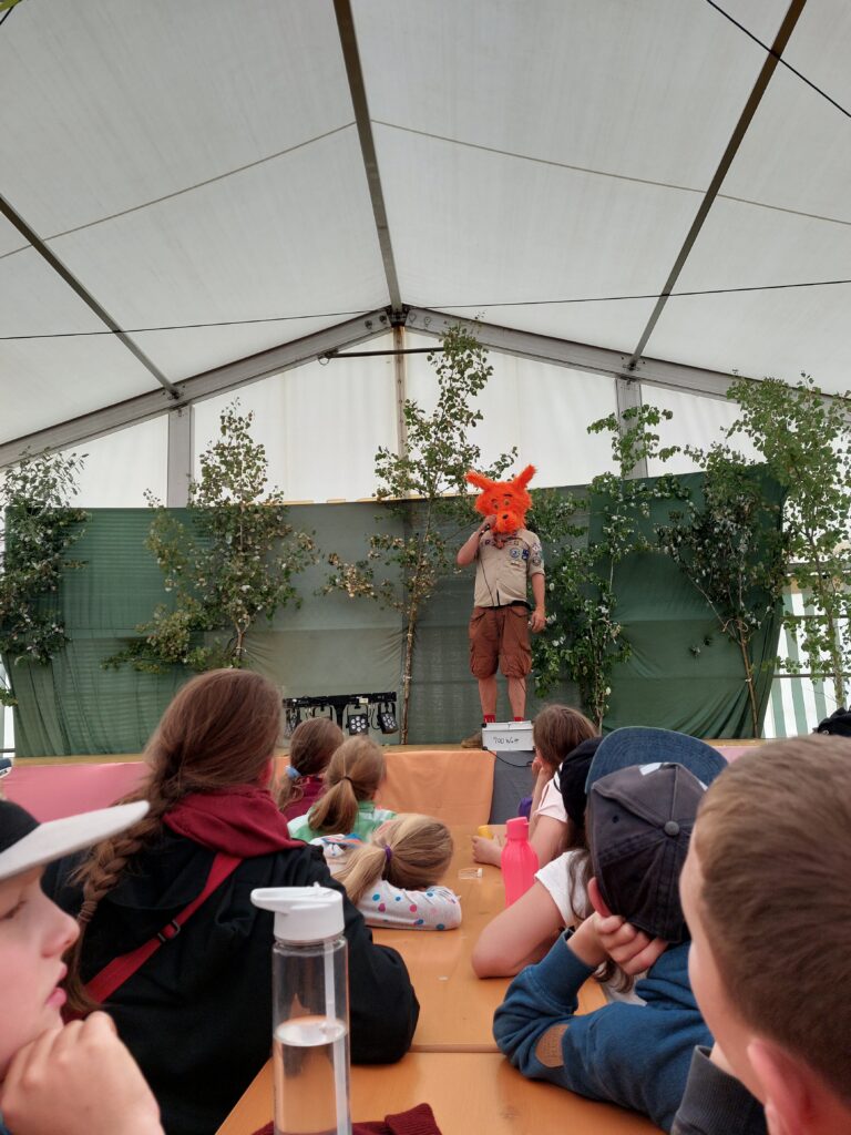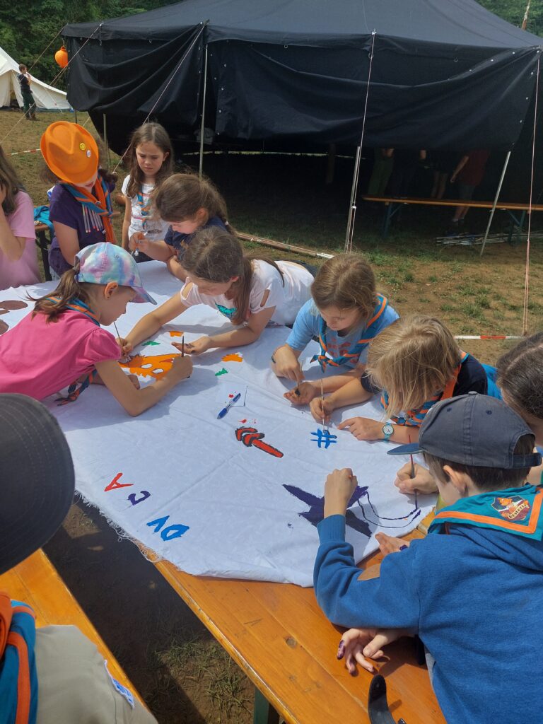 Am nächsten Tag verschönerten wir unseren Zeltplat mit Lagerbauten, wie einem Lagertor, Mülleimern und einem schwarzen Brett. Das Programm an den Nachmittagen war immer frei wählbar. Man konnte zum Beispiel ins „Kloster zum hüpfenden Wölfi“, um dort zu basteln, auf Teppichen zu entspannen oder zu lesen. Hier traf man auch auf die „Offenen Ohren“, die den Kindern halfen, wenn sie unangenehme Situationen erlebt haben oder es Streitigkeiten oder Heimweh gab. Ansonsten konnte man auch die Stadt der Handwerker:innen „Wösteria“ besuchen. Hier hatte man die Möglichkeit Bücher zu binden, Kerzen zu ziehen, Schmuck herzustellen oder mit Speckstein zu arbeiten. Wenn man Lust auf Süßigkeiten oder Kakao hatte, konnten sich die Wölflinge im Cafe zum tänzelnden Einhorn versorgen. Hier konnte man auch Postkarten verschicken oder abends an einem Quiz oder einem Bingoabend teilnehmen. In der Zauberwald-Werkstatt gab es die Möglichkeit sich T-shirts zu bedrucken, Tattoos und Aufkleber zu kaufen oder Fotos zu machen.
