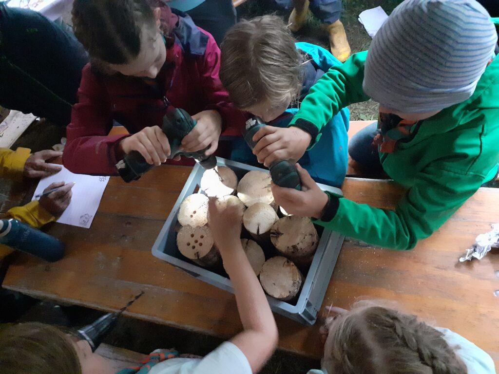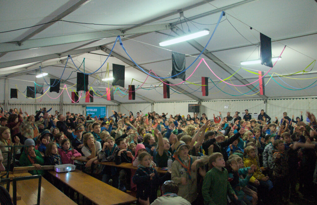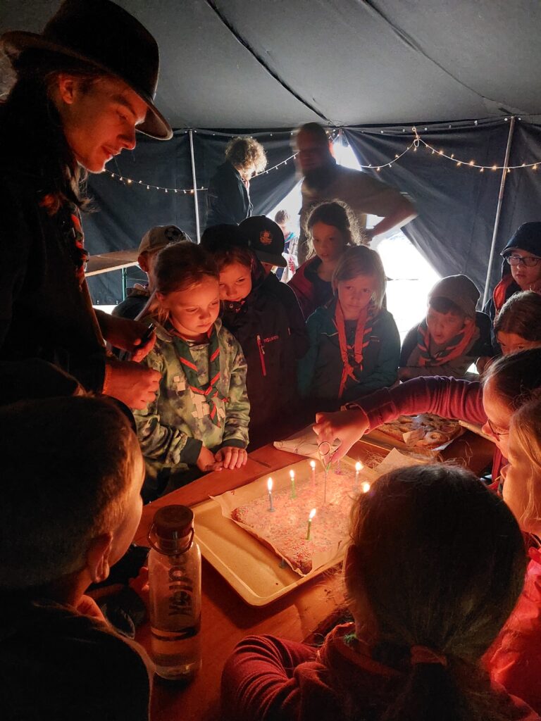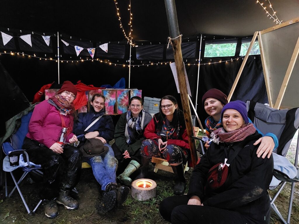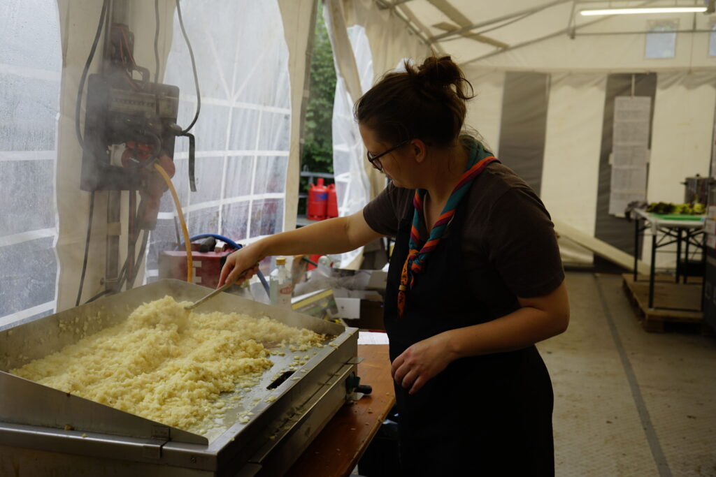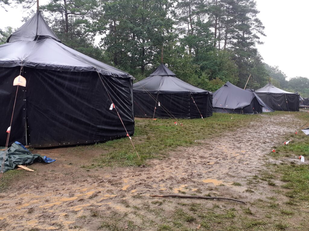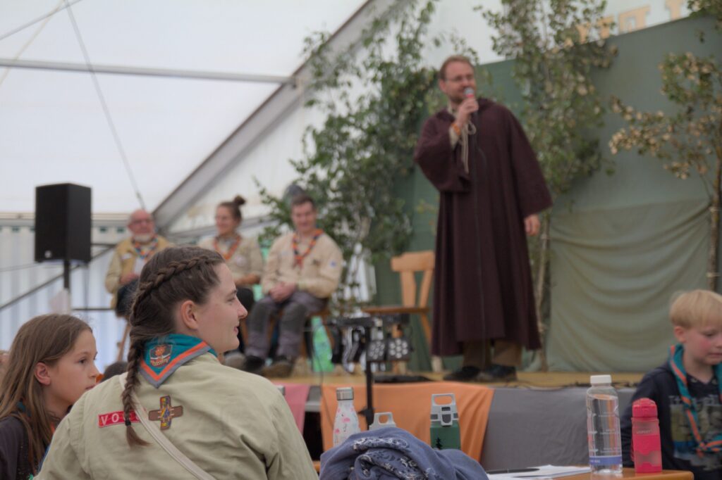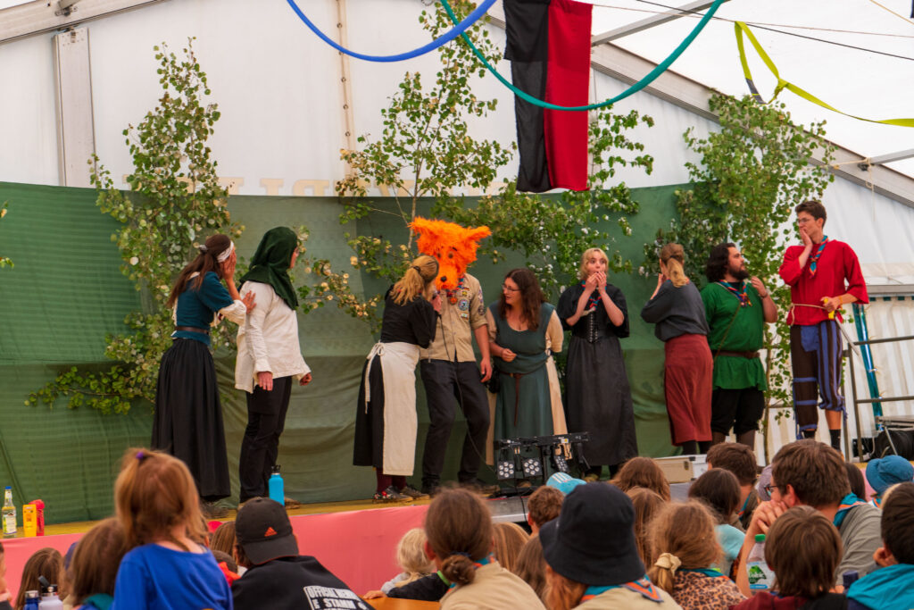 Am nächsten Tag verschönerten wir unseren Zeltplat mit Lagerbauten, wie einem Lagertor, Mülleimern und einem schwarzen Brett. Das Programm an den Nachmittagen war immer frei wählbar. Man konnte zum Beispiel ins „Kloster zum hüpfenden Wölfi“, um dort zu basteln, auf Teppichen zu entspannen oder zu lesen. Hier traf man auch auf die „Offenen Ohren“, die den Kindern halfen, wenn sie unangenehme Situationen erlebt haben oder es Streitigkeiten oder Heimweh gab. Ansonsten konnte man auch die Stadt der Handwerker:innen „Wösteria“ besuchen. Hier hatte man die Möglichkeit Bücher zu binden, Kerzen zu ziehen, Schmuck herzustellen oder mit Speckstein zu arbeiten. Wenn man Lust auf Süßigkeiten oder Kakao hatte, konnten sich die Wölflinge im Cafe zum tänzelnden Einhorn versorgen. Hier konnte man auch Postkarten verschicken oder abends an einem Quiz oder einem Bingoabend teilnehmen. In der Zauberwald-Werkstatt gab es die Möglichkeit sich T-shirts zu bedrucken, Tattoos und Aufkleber zu kaufen oder Fotos zu machen.