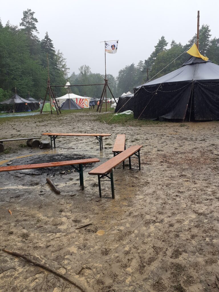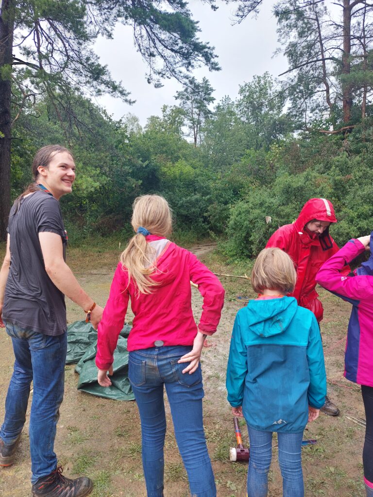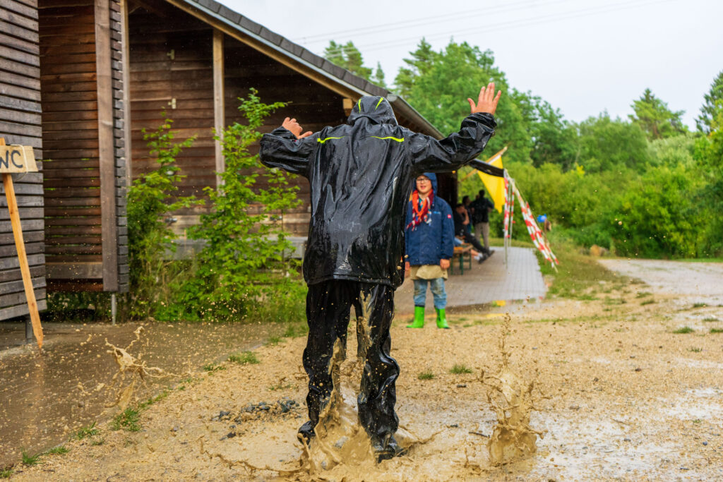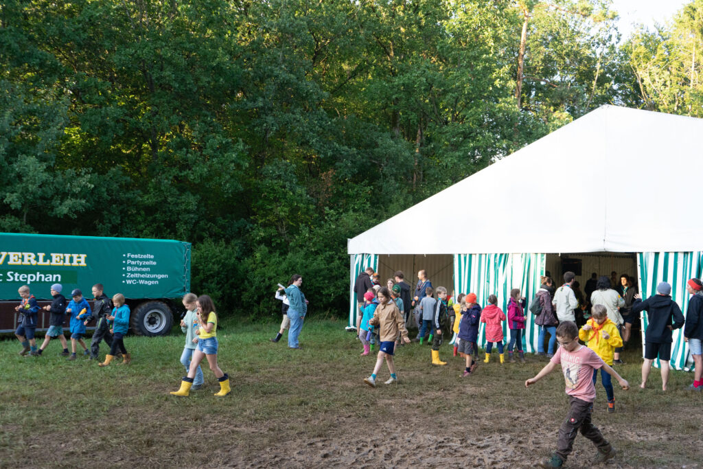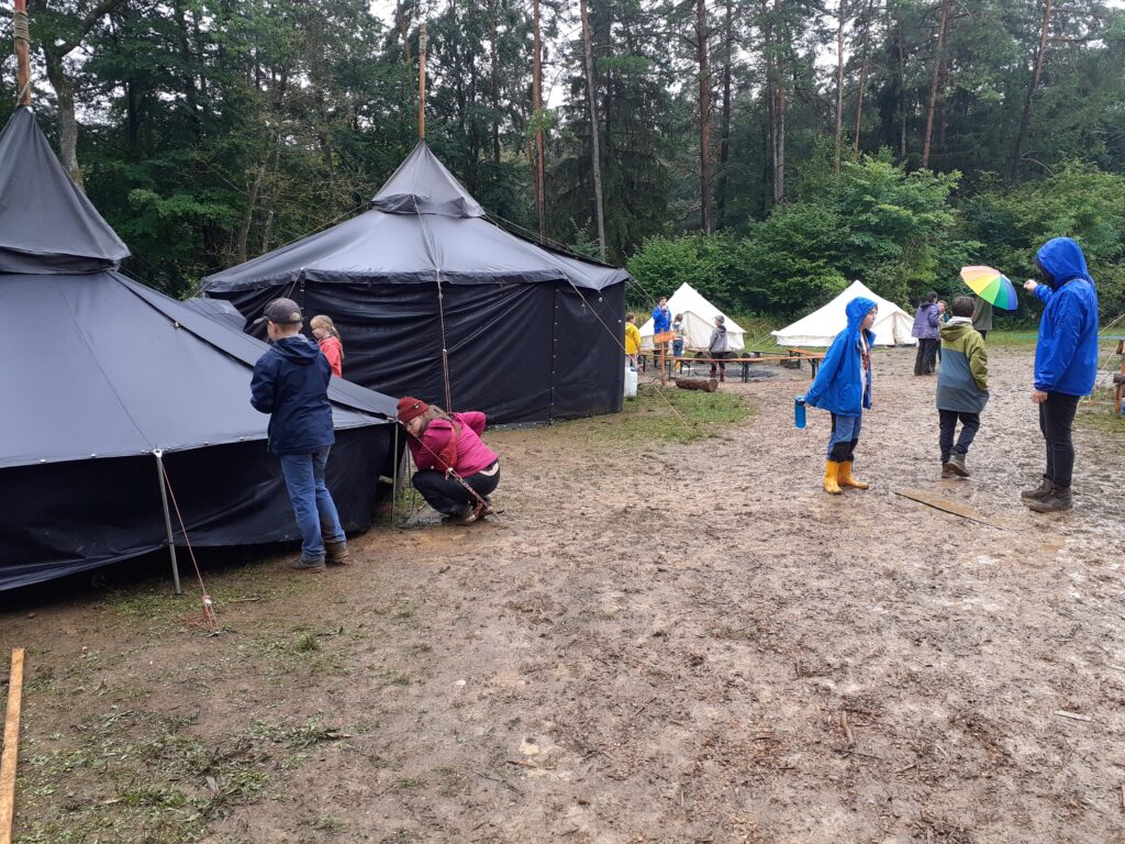 Voller neuer Eindrücke ging der zweite Tag zu Ende und die Kinder schliefen zum prasselndem Regen ein. Nach dem Frühstück ging dann der Jahrmarkt los. An verschiedenen Stationen konnten die Wölflinge zum Beispiel Riesenjenga, Völkerball oder Boccia spielen. Sie konnten jonglieren und anschleichen üben, schnitzen, bowlen, auf einer Slackline balancieren und vieles mehr. Nachmittags war wieder offenes Programm und die Kinder durften ihn nach Lust und Laune selbst gestalten. Nach dem Lagergottesdienst mit viel Gesang und einem Schauspiel durch Kinder aus unserem Stamm gab es Abendessen. Nach der täglichen Zahnputzparty und Abendrunde mit allen Kindern aus unserem Dorf ging es ins Bett. Erneut schliefen die Kinder mit dem Regenprasseln im Ohr ein.
