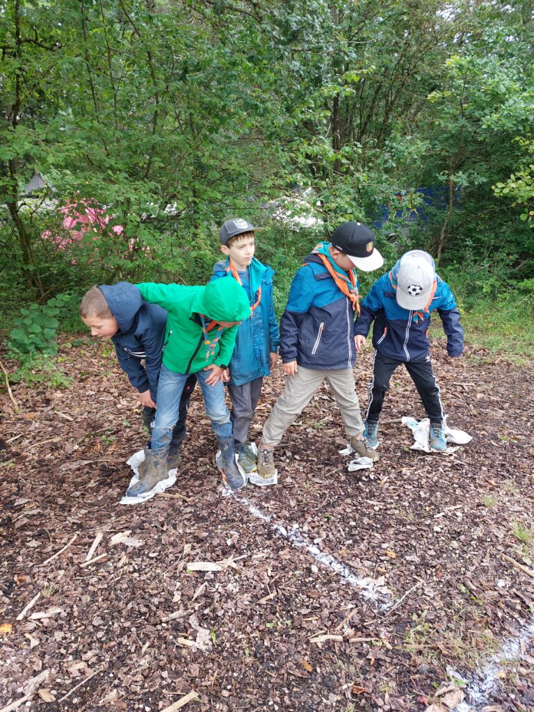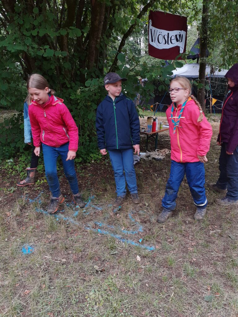 Der Mittwoch startete mit viel Regen. Wir ließen uns davon aber nicht unterkriegen. Vormittags fand ein Geländespiel in Kleingruppen statt, bei dem man unterschiedliche Aufgaben meistern musste. Trotz Regen war die Motivation hoch und die Wös konnten bei den Spielen Zutaten für einen Zaubertrank erspielen. Mit diesem haben wir Wölfi abends dann endlich vom Amulett befreien können.