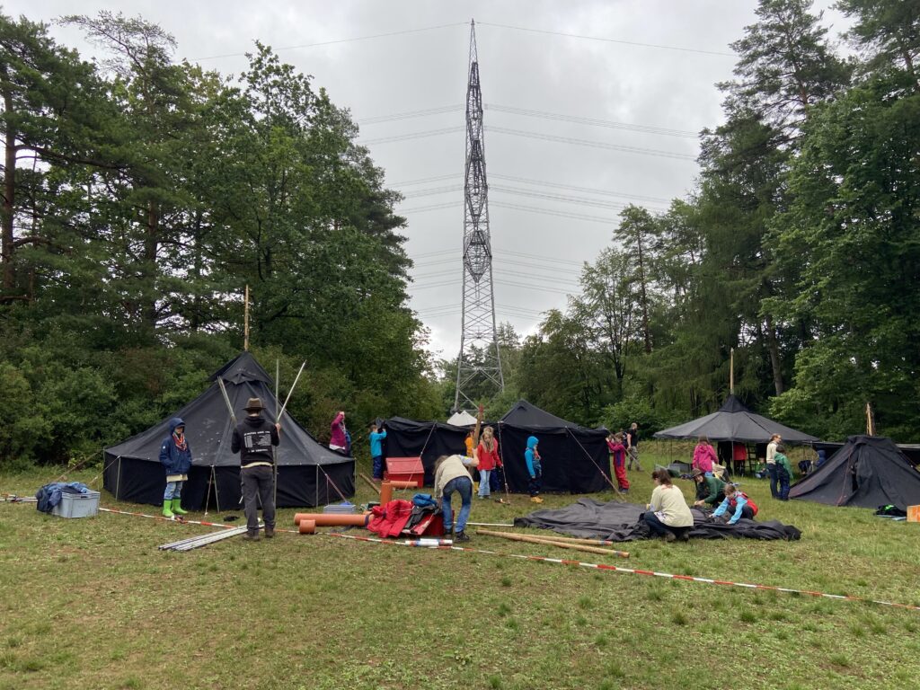 Zum Beginn der Sommerferien fuhren 18 Wölflinge und 4 Leitende nach Rothmannsthal zum Wölflingsbayernlager „Wösteria – Wölfi im Zauberwald“. Gemeinsam mit über 400 weiteren Pfadfindern wurden wir von der Helfercrew am verregneten Zeltplatz in Empfang genommen. Als die Zelte standen und sich alle eingerichtet hatten, wurden wir abends von Wölfi begrüßt (dem Maskottchen der Wölflingsstufe). Nach Zahnputzparty und Nachtwanderung ging es dann für die Kinder ins Bett.